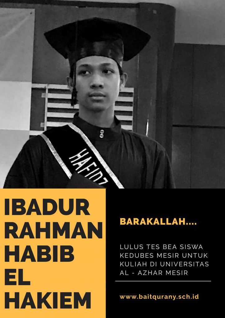 Alhamdulillah Santri MA Bait Qur’any Ibadurrahman Habib El Hakiem lulus tes di kedubes Mesir untuk kuliah di universitas AL Azhar Mesir.