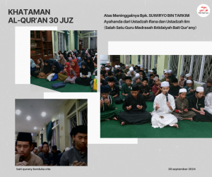 Untuk itu Bait qur’any mengadakan Doa dan Khataman Al-qur’an 30 juz, Agar Amal-amal Almarhum selama di dunia di terima di sisi Allah SWT. Semoga Allah SWT memberi keikhlasan serta ketabahan kepada Keluarga yang di tinggalkan.