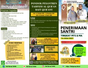 Pondok Pesantren Bait Qur’any mengajak seluruh orang tua, wali, dan masyarakat untuk memberikan pendidikan terbaik bagi putra-putrinya. Di sini, bukan hanya hafalan Qur’an yang dibangun, tetapi juga karakter, kedisiplinan, wawasan keilmuan, serta ruh perjuangan sebagai penerus kebaikan umat.