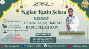 Kajian Mingguan yang diselenggarakan pada hari Selasa, 1 Juli 2025, membahas tentang perjalanan hijrah Rasulullah SAW dari Mekah ke Madinah. Buya Dr. H. Nurul Habiburrahman Nuddin MA menjelaskan tentang latar belakang, proses, dan hikmah dari peristiwa hijrah tersebut.