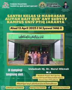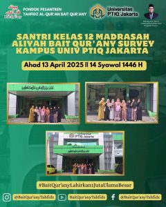 Jakarta, 13 April 2025 – Sebanyak [ 07 orang ] santri kelas 12 Madrasah Aliyah Bait Qur’any, South Tangerang, Banten, melakukan studi banding ke Universitas PTIQ Jakarta pada Ahad, 13 April 2025, bertepatan dengan 14 Syawal 1446 H. Kegiatan ini didampingi langsung oleh Ustadzah Hj. Dr. Nurul Hikmah M.A., Mudiroh Ponpes Bait Qur’any, sekaligus dosen di UIN Syarif Hidayatullah Jakarta dan Universitas PTIQ Jakarta.