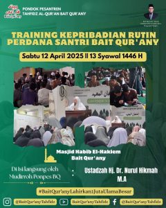 Tangerang Selatan, Sabtu 12 April 2025 – Masjid Habib El-Hakiem Bait Qur’any, dengan kegiatan Training Kepribadian Rutin Perdana bagi para santri Pondok Pesantren Bait Qur’any. Kegiatan yang diselenggarakan pada Sabtu, 12 April 2025, bertepatan dengan 13 Syawal 1446 H, ini di isi langsung oleh : Ustadzah Hj. Dr. Nurul Hikmah M.A., Mudirroh Ponpes Bait Qur’any, sebagai pemateri.
